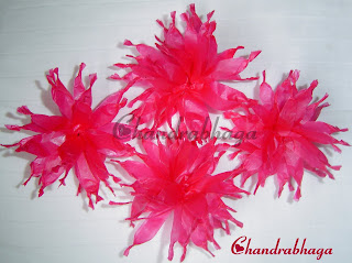 Cut a long strip (about 15 inches length and width of about 5 inches) out of the tissue paper. Fold it into two. Now you have a 2-ply sheet of dimension 15* 2.5 inches. Cut the full stretch of the paper until the center (not on the folded side) with frequent intervals (about 1.5 cm). Twist the ends as shown in the above picture. Starting at an end, crush and roll it to make a flower (Insert a metal string while rolling if you need a stem). Tie with a thread.